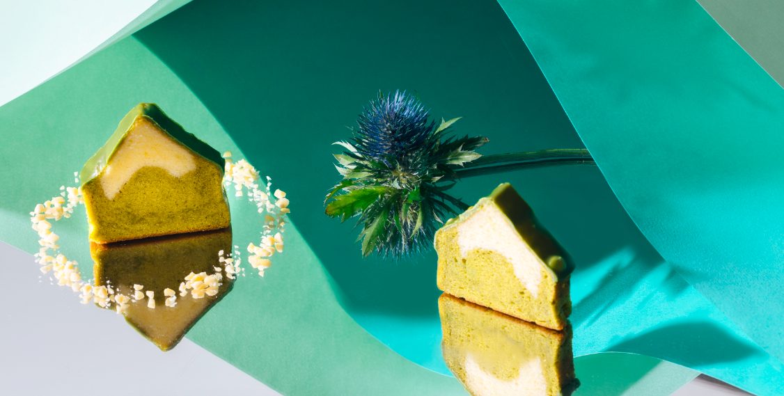 Stay gold琥珀金莎蛋糕,是用紅烏龍茶搭配金沙(鹹蛋)口味;Utopia抹茶鹽之花是抹茶搭配鹽之花、Retro filiter榛果鐵觀音是鐵觀音茶配榛果。